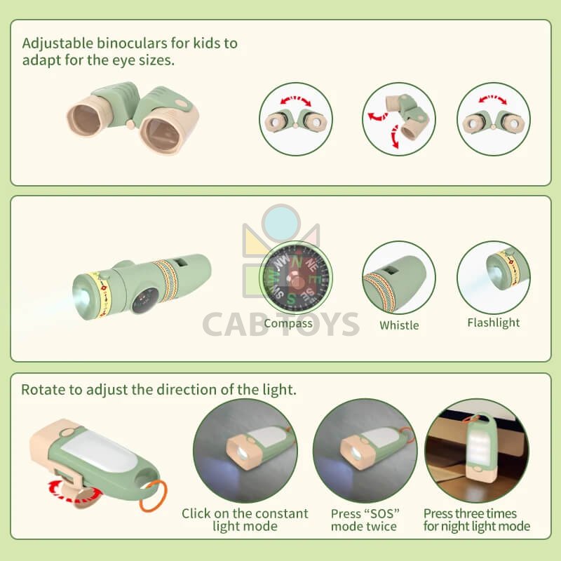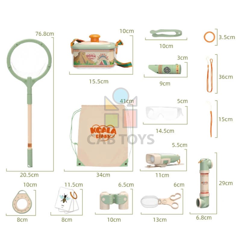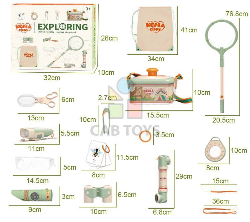 2. Kompletní vybavení pro malé průzkumníky : Děti mohou pozorovat ptáky s dalekohledem, zkoumat drobný hmyz pomocí lupy či síťky a vydat se na dobrodružství s kompasem a multifunkční píšťalkou.